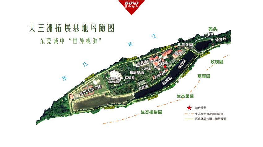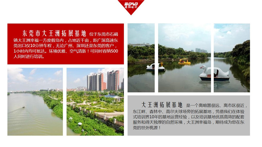 東莞市大王洲拓展基地位于東莞市石碣鎮(zhèn)大王洲幸福一方度假島內(nèi),占地近千畝,距廣深高速東莞出口僅10分鐘車程,無論廣州、深圳還是東莞的客戶,1H內(nèi)均可抵達。環(huán)境優(yōu)雅、空氣清新!可同時容納500人同時進行培訓(xùn)。林蔭遍布,風(fēng)景優(yōu)美,島上屋角欲顯還藏,別有一番大自然的風(fēng)味;東江之水阻隔了來自鬧市的喧囂,島嶼上安靜寧人。遠遠望去,大王洲島似都市中的綠色翡翠;徜徉其間,又像是步入了人間仙境。