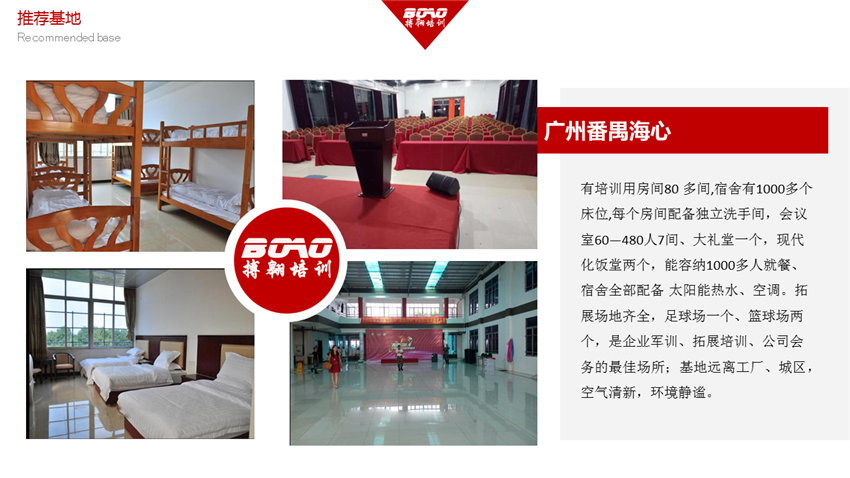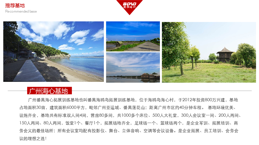 廣州番禺海心拓展訓(xùn)練基地也叫番禺海鷗島拓展訓(xùn)練基地,位于海鷗島海心村,于2012年投資800萬興建,基地占地面積30畝,建筑面積6000平方,毗鄰廣州亞運(yùn)城、番禺蓮花山;距離廣州市區(qū)約40分鐘車程。 基地環(huán)境優(yōu)美、設(shè)施齊全,基地共有標(biāo)準(zhǔn)雙人間4間,營(yíng)房80多間,共1000多個(gè)床位、500人大禮堂,300人會(huì)議室一間、200人兩間、150人兩間、80人兩間,飯?zhí)?個(gè)、餐廳1個(gè),拓展場(chǎng)地齊全,足球場(chǎng)一個(gè)、籃球場(chǎng)兩個(gè),是企業(yè)軍訓(xùn)、拓展培訓(xùn)、商務(wù)會(huì)義的最佳場(chǎng)所;所有會(huì)議室均配有投影儀、舞臺(tái)、立體音響、空調(diào)等會(huì)議設(shè)備。是企業(yè)拓展、員工培訓(xùn)、會(huì)務(wù)會(huì)議的理想之選!