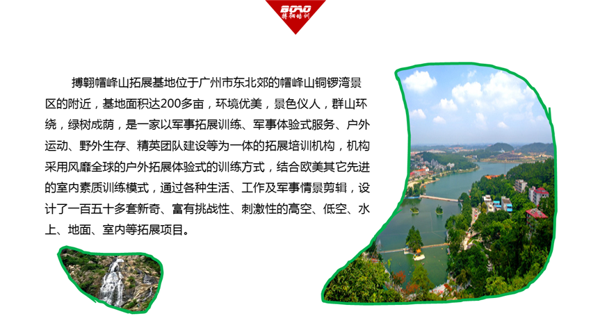 廣州帽峰山野戰(zhàn)拓展訓(xùn)練基地風(fēng)景宜人的位于廣州市東北郊的帽峰山銅鑼灣景區(qū)的附近,良田第一小學(xué)旁邊,占地面積200畝,可同時(shí)容納1000余名學(xué)員住宿和進(jìn)行拓展訓(xùn)練。是廣東地區(qū)設(shè)備齊全、場(chǎng)地寬闊、配套設(shè)施完備、持有省公安廳發(fā)放的彩彈合法槍牌的正規(guī)的野戰(zhàn)拓展基地?;匾浴昂霌P(yáng)愛國(guó)主義、普及國(guó)防教育、培育團(tuán)隊(duì)精神”為經(jīng)營(yíng)主旨,為企事業(yè)提供專業(yè)的團(tuán)隊(duì)活動(dòng)服務(wù)。