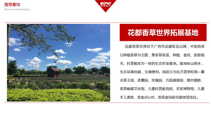 廣州花都香草世界拓展訓(xùn)練基地位于廣州市花都區(qū)花山鎮(zhèn)鐵山村,以公司加農(nóng)戶方式連片種植食用香草、食用花卉,占地面積近600多畝?;ǘ枷悴菔澜缰黝}定位為香草王國、繽紛樂園,以融入“珠三角經(jīng)濟圈”和“泛珠三角經(jīng)濟圈”為發(fā)展理念,打造以綠色生態(tài)、休閑度假、商務(wù)會議為主的特色旅游產(chǎn)業(yè)體系,以旅游觀光、農(nóng)業(yè)示范為主題,力爭打造成一個集休閑、旅游、度假、會議為一體的農(nóng)業(yè)科技旅游生態(tài)公園。