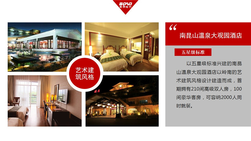 以五星級(jí)標(biāo)準(zhǔn)興建的南昆山溫泉大觀園酒店以嶺南的藝術(shù)建筑風(fēng)格設(shè)計(jì)建造而成,首期擁有210間高級(jí)雙人房、100間豪華客房,可容納2000人同時(shí)就餐。