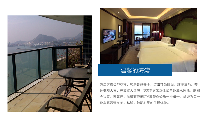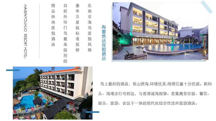 島上最好的酒店,依山傍海,環(huán)境優(yōu)美,地理位置十分優(yōu)越。距碼頭、海灘步行可到達(dá),與香港遙海相望。是集商務(wù)住宿、餐飲、娛樂(lè)、旅游、會(huì)議于一體的現(xiàn)代化綜合性涉外旅游酒店。